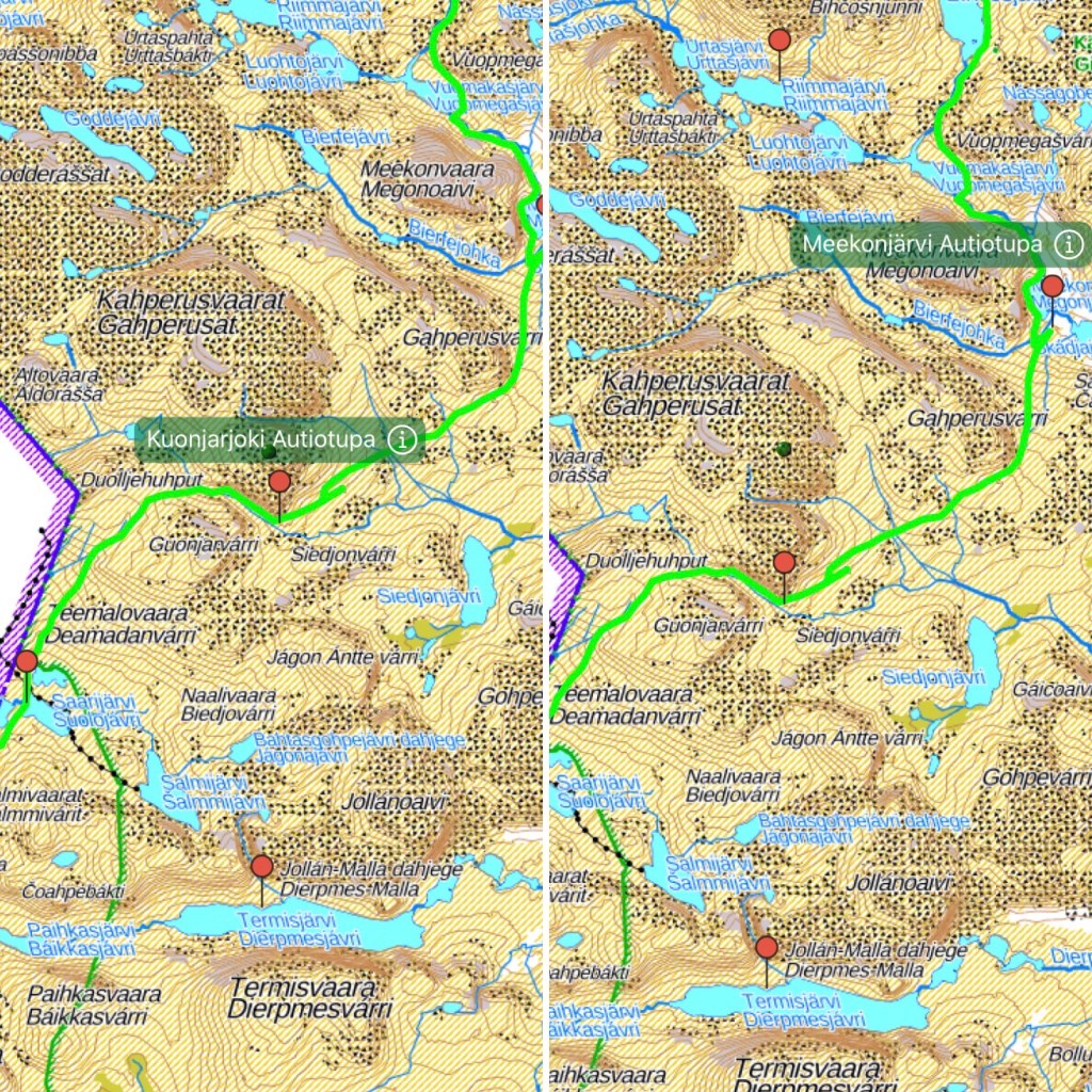 12km taittui 6,5 tunnissa ja päädyttiin noin klo 23 Saarijärven autiotuvalle. Pimeässä vaeltaminen oli kokemus itsessään kun haastetta toi juurikin tuo soinen ja rakkainen maasto. Välissä kyllä sammutettiin otsalamput ja jäätiin vaan ihastelemaan ääretöntä tähtitaivasta ja linnunrataa, joka meille näyttäytyi yössä. Autiotuvan maastosta tai maisemista ei nähty mitään yöllä kun saavuttiin ja aamulla meitä odottikin mitä kaunein ylläri. Tuvassa meidän kolmen lisäksi oli kolme muuta niin päästiin aika väljästi vielä nukkumaan yö. Pimeävaelluksesta oppi taas sen, että oma otsalamppu ei ole tarpeeksi tehokas kun valaisi vaan muutamia metrejä eteenpäin eli se menee seuraavaksi hankintalistalle. Onneksi mun Garminin Fenix 6s sapphire kellossa on gps niin pystyttiin sen ja Lindan paremman otsalampun kanssa navigoimaan perille kun reittimerkit Kalottireitillä ovat noin 1m korkuisia puisia keppejä minkä päässä oranssi maali, mitä hädintuskin tuolla maastossa näkee.
