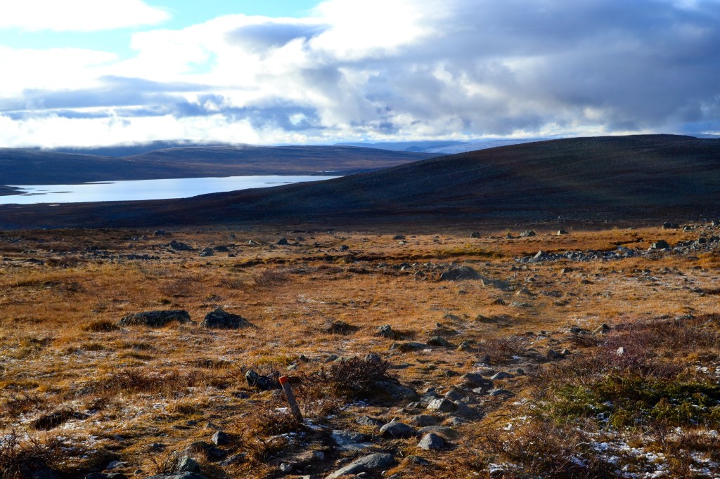 Ensimmäinen vaelluspäivä alkoi sen verran myöhään, että vähän jännitettiin sitä miten vaellus pimeässä sujuu. Päätettiin jo alkutekijöissä, että mennään niin pitkälle ekana päivänä tai lähinnä iltana kun jaksaa ja jos ei päästä Saarijärven autiotuvalle asti (Kilpisjärven luontokeskukselta noin 12km) niin pystytetään teltta matkan varrelle. Maasto Kilpisjärveltä alkoi tunturikoivikkoisena järven rantaa pitkin Saanatunturia ihaillen ja aika nopeasti vaihtui rakkaiseksi (kivikkoa) poluksi ja mutaiseksi suoksi. Pimeys alkoi hiipiä päälle parin tunnin vaelluksen jälkeen ja ei oltu päästy edes vielä Norjan rajalle (kyllä, reitti meni noin 2km Norjan puolella, eikä lähdetty pimeyden takia kiertämään rajaa kun ei oltu varma minkälaista maastoa olisi luvassa ja olisiko se enemmän turvallisuusriski lähteä kiertämään). Norjan pätkä reittiä oli kuivempi ja helppokulkuisempi ja naureskeltiinkin sitä, että kaikki on heti paremmin kun päästiin Norjan puolelle.