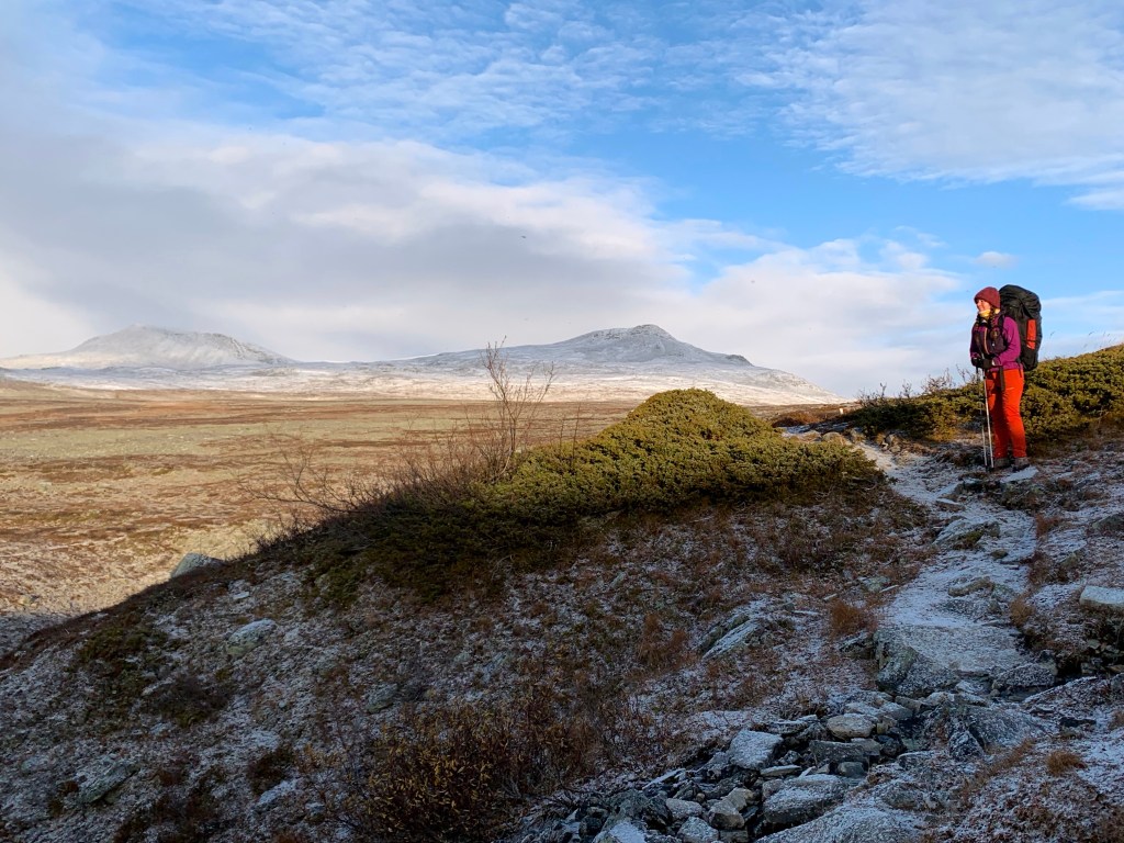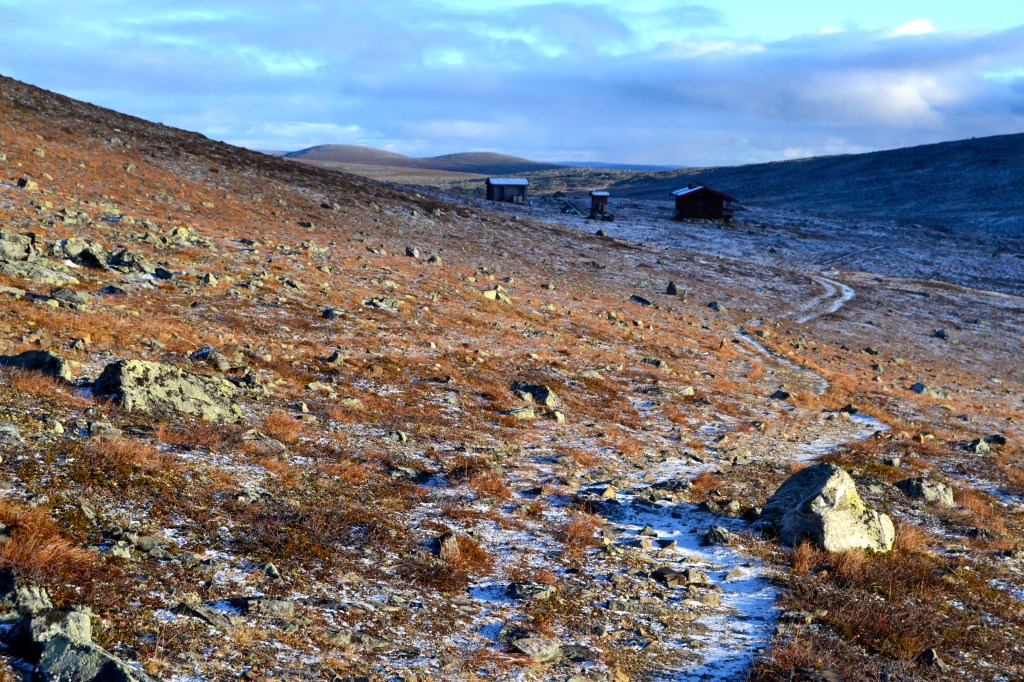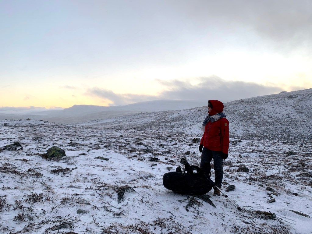 Reitti itsessään ei ollut haastava, mutta kyllä se pitkä nousu tunturille hiukan alkoi pakaroissa tuntumaan. Omassa kehossani olen huomannut sen, että ensimmäiset vaelluspäivät ovat usein nihkeähköjä ja rinkka painaa ja joka paikkaa kolottaa. Parin päivän jälkeen keho alkaa tottua vaelluksen rasitukseen ja rinkan painoon ja alkaa kintut kulkemaan vikkelämpää. Vikoina päivinä ei oikein tunnu enää missään ja energiaa on vaikka muille jakaa. Vaikka kuivasin lähes kaiken ruokani, painoi rinkka noin 20-25kg reissuun lähtiessä (me jaettiin yksi yhteinen 3hlö talviteltta myös päivittäin). Olin varannut runsaasti energiaa eli suklaata ja herkkuja ja niitä jäi jopa yli eli ensi kerralla herkkuja vähemmän. Myös näin talven kynnyksellä vaatetta tuli otettua enemmän mukaan ja kahdet alus- ja välikerrastot jos toiset kastuu sateessa/lumessa/puroon molskahtaessa.