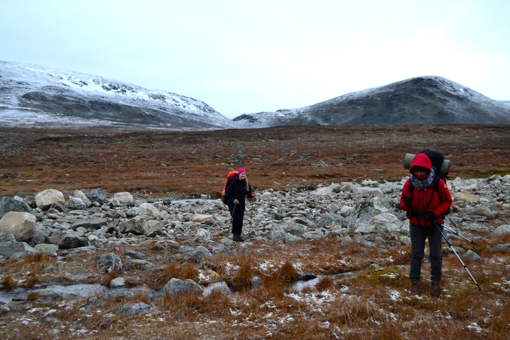 Meekonjärven ja Kuonjarjoen välissä on myös muutama joenylitys ja menomatkalla ne sujuivat lähes ongelmitta. Vesi oli matalalla ja pääsimme suhteellisen simppelisti hyppelemään kivien päältä. Nyt paluumatkalla kun kelit olivat olleet pakkasella ja luntakin tullut, teki se ylityksestä haastavamman kun suurin osa kivistä oli jään peittämät. Edelleenkään emme halunneet kahlata paljain jaloin niin heittelimme itse isohkoja kiviä poluksi ja pääsimme niiden avulla purojen ja jokien yli. Kuonjarjokea kohti tallustaessamme alkoi taas sataa lunta ja tuulikin yltyi. Emme tosin tienneet vielä mikä seuraavaa päivää odotti kun saavuimme lumipyryssä Kuonjarjoen autiotuvalle iltasella.