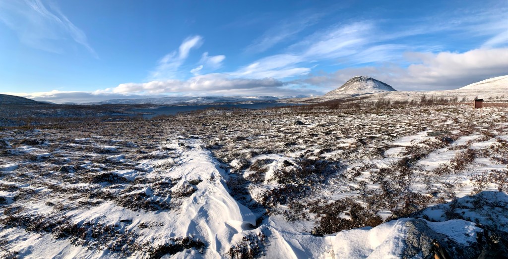 Pihtsusjärveltä Haltin autiotuvalle matkaa oli noin 7km ja ensimmäiset vuorimaiset maisemat meille tarjosi reitin itäpuolella Ridnitsohkka-tunturi, joka itseasiassa on Suomen korkein huippu mitä tulee tunturiin, joka seisoo täysin Suomen puolella ja sen länsipuolella komeili Pikku-Halti. Haltin korkein huippu on itseasiassa Norjan puolella (1361m) ja se matalampi huippu Suomessa (1324m). Lumipyry yltyi mitä lähemmäksi päästiin Haltin tupaa, samoin kuin pimeys.