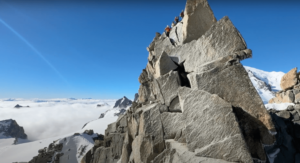 Ennen Blancia teimme myös Monte Rosalla akklimatisointia ja huiputimme kaksi yli 4500m huippua, mutta niistä lisää toisena kertana. Blancin jälkeen yhtenä unelmana oli tehdä Arete des Cosmiques harjannekiipeilyreitti Chamonixn puolella mitä olen kuolannut jo vuodesta 2019 lähtien. 2019 katsoin, että reitti näyttää hullulta ja pelottavalta, kun omaa kokemusta kiipeilystä oli vasta vähän, mutta reitti jäi silti kutkuttelemaan mieltä. 2022 oli tarkoitus tehdä Cosmiques, mutta se ”suljettiin” turvallisuussyistä juuri ennen, kun olin palaamassa Italian puolelta takaisin Ranskaan, kun siellä laajeni reitin varrella oleva reunarailo ja jossain vaiheessa yksi seinämäkin rojahti alas jäätikölle. Nyt 2023 buukkasin itseni hyvissä ajoin Cosmiquelle Compagnie des Guides Chamonixn kautta ja päätin tehdä sen Blanc-viikon jälkeen. Tapasin oppaani Lucien Boucansaudin ja meidän tiimin toisen kiipeilijän Yoshin Japanista Chamonixssa hissiaseman luona ja lähdimme siitä kolmistaan hisseillä kohti Aiguille du Midin yläasemaa 3800m korkeuteen. Jännitys oli kova, kun on nähnyt reitin Midin hissiasemalta ylhäältä käsin ja nähnyt reitin loppupään kiipeilyt ja kiipeilijät, kun he nousevat kallioita pitkin ja loppuvaiheessa tikkaita pitkin takaisin Midin aseman ulkoterassille.