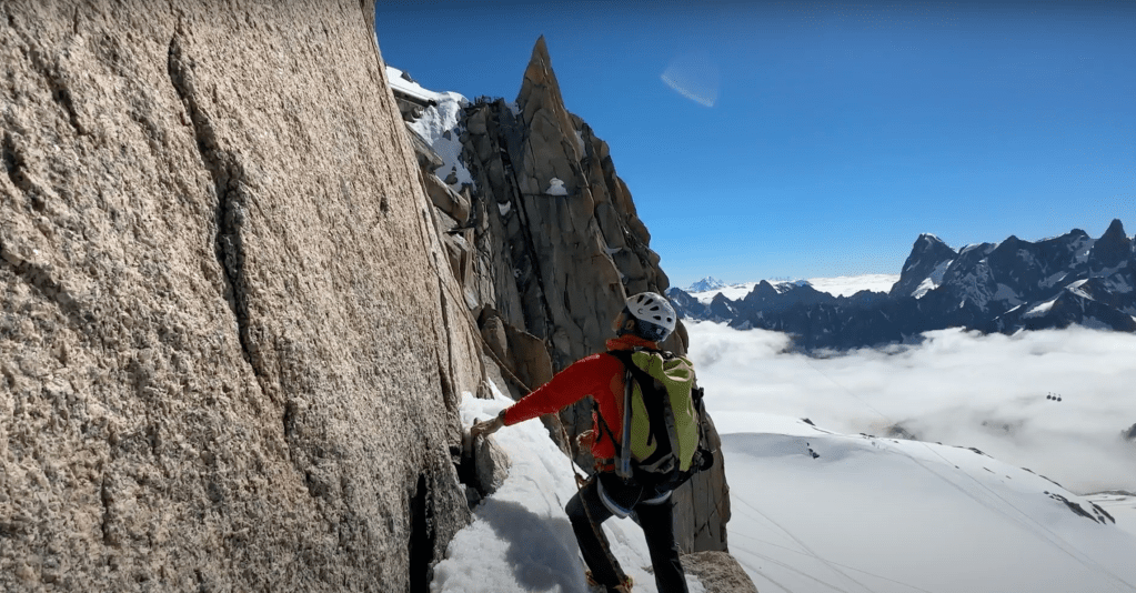Ensimmäinen pätkä Midin asemalta on jäätikköä ja sen ylittämistä ja itse kiipeilyllinen pätkä Cosmiquen reittiä on kiipeilyä paljaalla kalliolla. Osa ottaa jääraudat pois jalasta, kun siirtyvät kallio-osuudelle, mutta meidän taktiikka oli jättää ne jalkaan, sillä muutamissa kohdissa matkalla ylös tulee lyhyehköjä lumirinteitä niin niissä jouduttaisiin joka tapauksessa laittaa raudat takaisin jalkaan. Kallioiden alkupäässä Lucien siirtyi etummaiseksi ja eteni vauhdilla ylöspäin. Ensimmäinen ns. pitch eli köydenmitta tai pätkä oli loivaa släbiä (positiivista kalliopätkää) ja sitä oli suhteellisen helppo kiivetä. Lucien varmisti kiipeilyämme trädipieceillä (camuilla ja kiiloilla halkeamiin) ja mun tehtävä viimeisenä oli aina kerätä ne pois mun valjaisiin. Jääraudat jalassa kiipeäminen kalliota pitkin ei ole mikään helpoin tehtävä, mutta nopeasti sitä taas oppi ja se alkoi sujumaan. Haastavin oli se, kun omat hanskat oli vähän löysät niin oli helpoin kiivetä ilman hanskoja, niin kauan, kun tarkeni. Reitti kiemurteli harjannetta pitkin ensin ylös, välillä oli todella korkeita jalan nostoja taas, välillä ängettiin koko kroppaa halkeamasta läpi ja sitten tuli laskeutumiskohtia. Ns. kruxi eli reitin vaikein kohta oli sileä släbikallio mihin oli tehty muutama ekstrareikä poralla jäärautojen kärkipiikkejä varten. Muutoin kallio oli aika paljas ja ainoastaan kädet sai kallion halkeamiin edetessä, jalkojen hipoessa pienenpieniä listoja kalliossa.