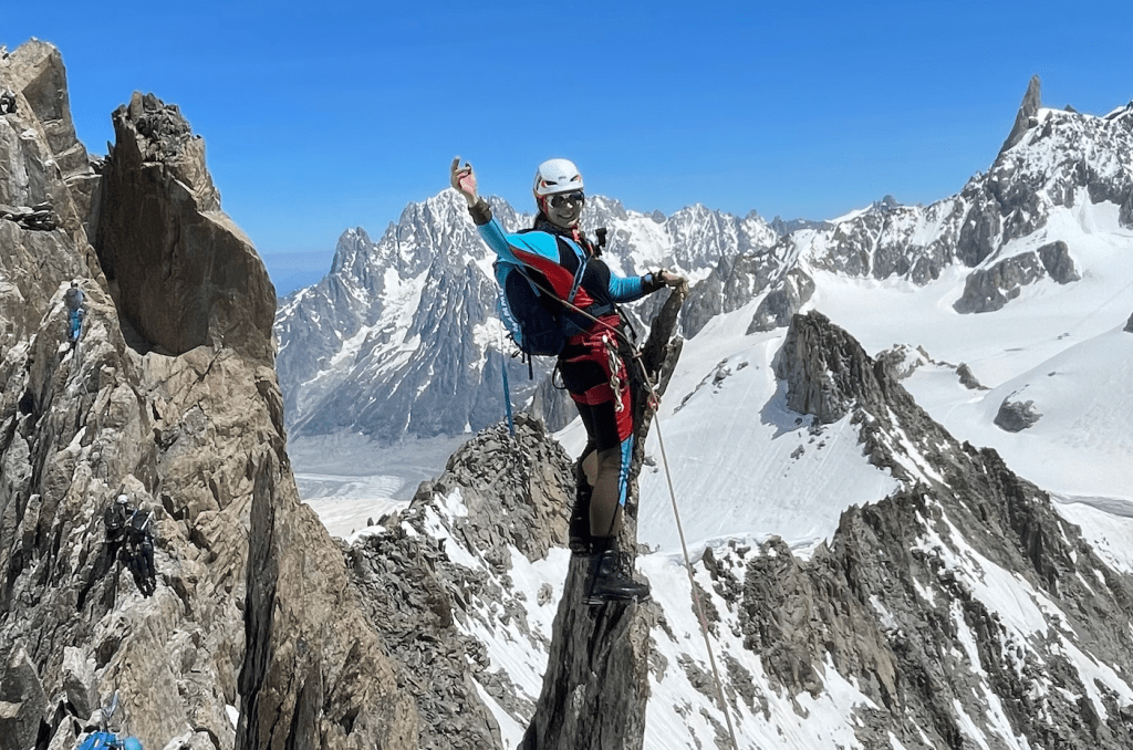 Vuonna 2019 olimme samaisella jäätiköllä, mutta keskityimme enemmän jäätiköllä liikkumiseen; jääraudat jalassa, hakku kädessä köysistössä liikkumista, erilaisia harjoituksia lumisissa rinteissä ja lumisessa maastossa ja sitten hieman testattiin lähellä olevaa kivirykelmää ns. scramble kiipeilynä eli kylläkin köydessä, mutta enemmän rymyten ylös, eikä niinkään kiiveten teknisempää seinämää. Tällä kertaa suuntasimme Torino Hut majan hissiasemalta vuorikamat päällä kahdessa köysistössä (Cristina + Vilma ja minä + Simo) kohti Aiguille d’Entrevesin alkua. Jäätikkölähestyminen oli ehkä tunnin-kahden setti överilämpimässä ”paistinpannukelissä” missä tuntuu, että koko keho paahtuu ja kiehuu sisältä päin auringon heijastuksen voimasta jäätiköllä. Varustetta oli aivan liian lämpimästi päällä ja lisäksi oli lennon jälkeen vasta eka päivä korkealla 3500m niin kehossa kyllä tuntui. Päällä oli Acliman paksumpi merinokerrasto, housuina LaSportivan Excelsior Pant, randoiluun tarkoitetut paksummat softshell-housut ja yläkropassa Rabin ohut softshelltakki. Kun päästiin Entrevesin alkupäähän kivikon luo, riisuin aika nopeasti LaSpon housut ja Rabin takin pois ja aloin kiipeämään harjannetta pelkät kalsarit päällä. Reppu tuntui myös liian painavalta, ainakin Cristinan mielestä. Asiakastyössä olen tottunut kantamaan järeämpää EA-laukkua mukana, niin Cristinan ilme oli hyvä kun hän kokeili mun reppua, mikä hänen mielestä oli painava ja sit kysyi mitä mulla siellä on ja näytin mun kilon painoisen EA-laukun. Sen jälkeisillä reissuilla olen omaa EA-laukkua pienentänyt roimasti, kun oppaalla sit taas on järeämmin kamaa mukana. Hyvä muistaa, että kun ollaan korkealla, kaikki painaa, niin ottaa vaan välttämättömän mukaan, ei ekstrahousuja, ei ekstrasukkia, ei liikaa snacksiä, ei liikaa nestettä yms.